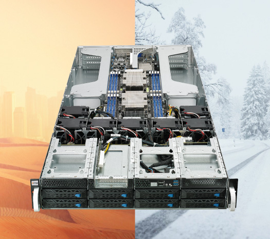 A 2U server, supporting dual-socket CPU, dual redundant power supply, external storage drive bays for expandable storage capacity, cooling system, 10C to 35C operating range, efficient and secured performance, especially suitable for virtual desktop and hyper-converged IT infrastructure environments.